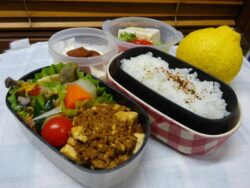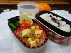 おはようございますまぁ~びっくりしました。今日のお弁当・麻婆豆腐・鯖焼き・ミニトマト・菜の花おひたし・ゆかり胡麻ごはん・ゆでたまご・ヨーグルト  杏 マヌカハニー・甘平みかん朝からびっくりです。だって、麻婆豆腐を作ろうとして、フライパンの横...