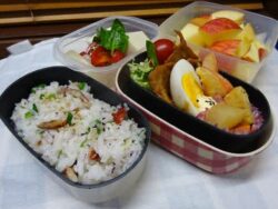 おはようございます昨日はソフトバンク、大変だったんですってね。今日のお弁当・チャーハン・白菜・ベーコン・帆立貝柱ホワイトソース煮・きゅうり・ミニトマト・ナス・鶏揚げみぞれ煮・巾着たまご・りんご・ヨーグルト  ローゼルジャム マヌカハニーホワ...