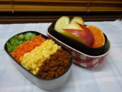 4色そぼろ丼のお弁当と、お楽しみに向かって