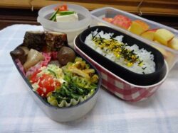 おはようございます今日は午後から雨だそうですよ。今日のお弁当・鰆の味噌漬け焼き・蓮根はさみ煮・白菜ベーコン煮・ひじき煮・カニカマくるくるたまごやき・きゅうり・トマト・きんぴらごぼうの混ぜご飯・玉ねぎ+豆腐+トマトサラダ・マスカット・みかんき...