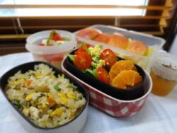 おはようございますなんて清々しいお天気今日のお弁当・チャーハン・ナス豚肉巻・にんじんナムル・ピーマン昆布・ミニトマト・きゅうり漬・玉ねぎ+豆腐+トマトサラダ・ジューシーフルーツあらら…。なんだか品数少ないお弁当になっちゃいましたね。でもまぁ...