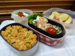 おはようございますこれから下り坂だそうですね。今日のお弁当・和風チャーハン・ミモザサラダ・マーマレード+梅ドレッシング・みかん・りんご・玉ねぎ+豆腐+トマトサラダ今日は簡単弁当。春っぽくミモザサラダにしてみました。ドレッシングは、頂きものの...